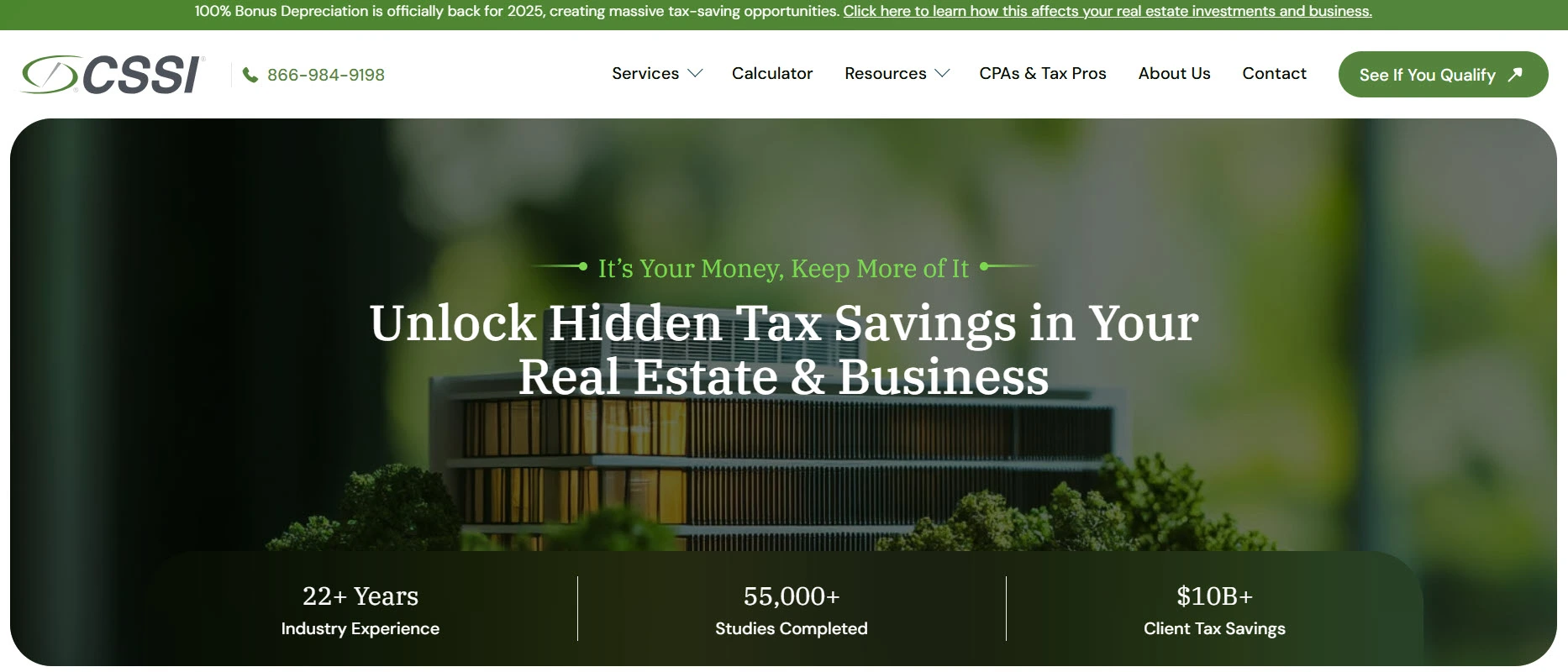 CSSI (Cost Segregation Services, Inc.) has completed over 50,000 studies and is best known for its ability to scale quickly across national portfolios. Their process begins with a no-cost initial analysis and includes engineering-based site visits and rapid report delivery. This makes them especially effective for owners working under time constraints or managing dozens of properties across states.